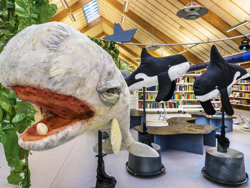 I udstillingen KASKELOTTERNES SANG kommer alle sanserne i brug, når børnene via lyd og lys møder livet under havets overflade og færdes blandt kaskelothvaler og farlige spækhuggere i tanggrønne omgivelser.
